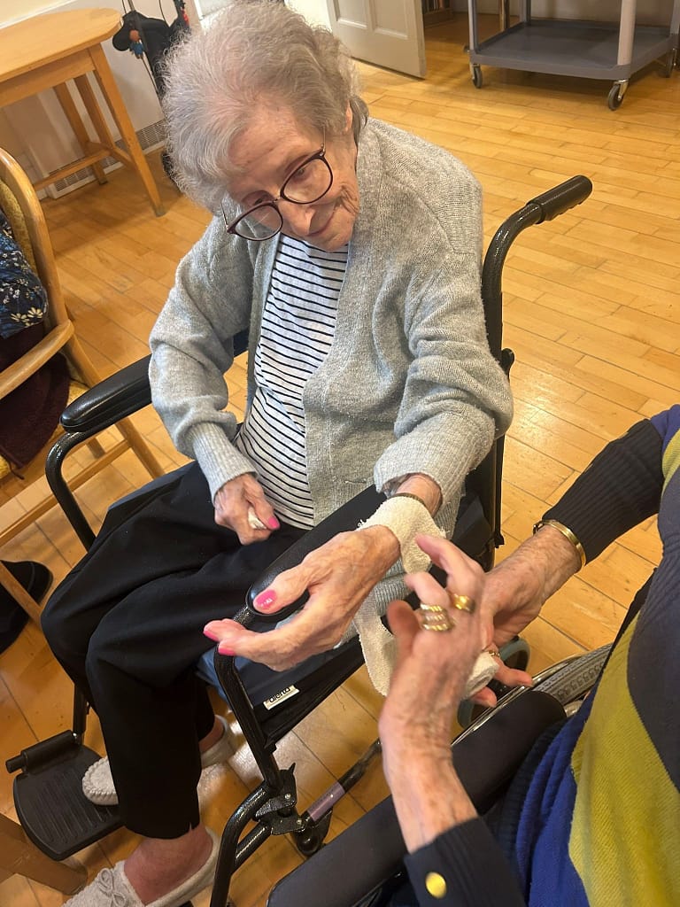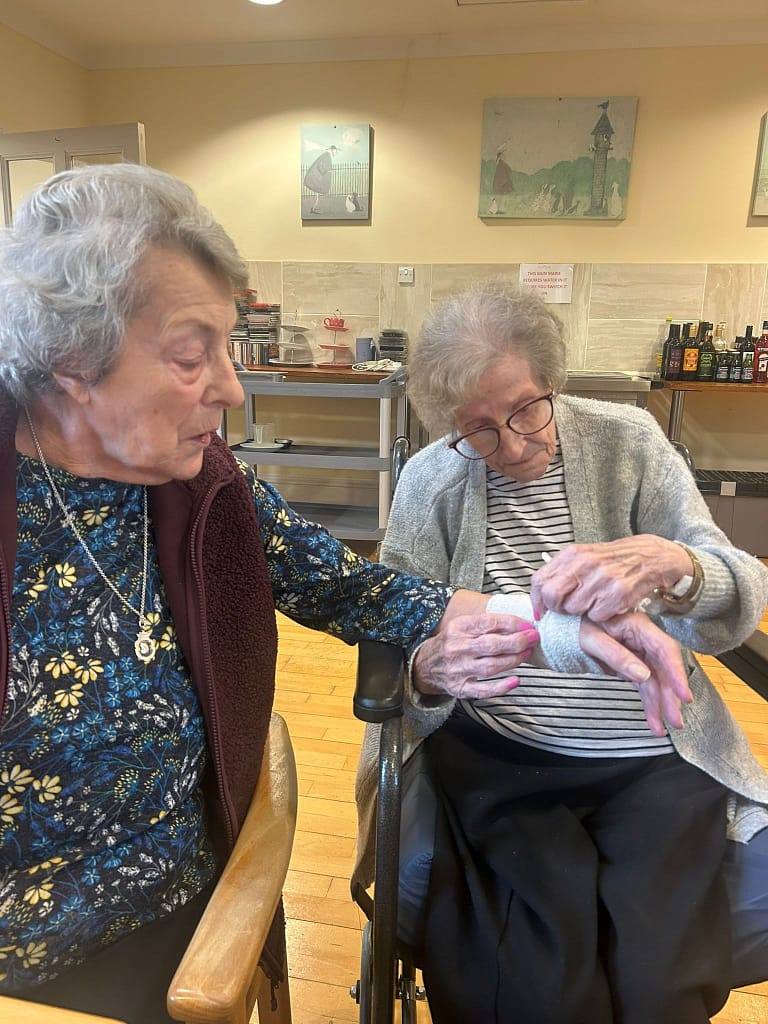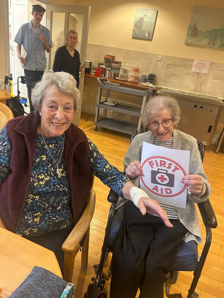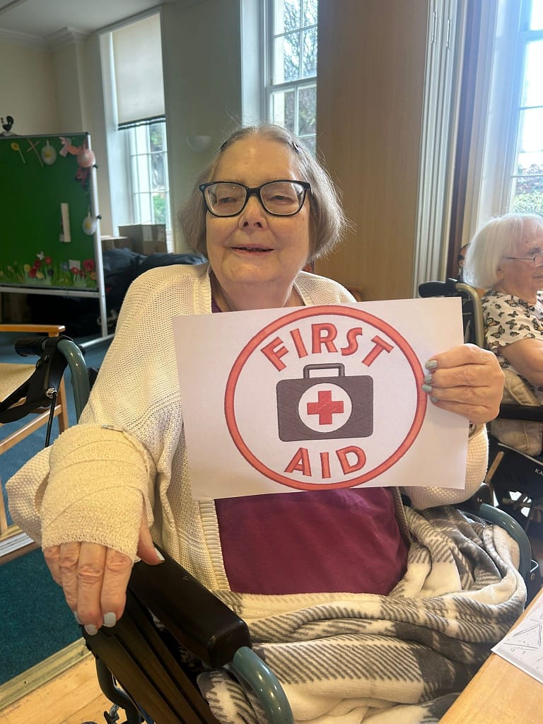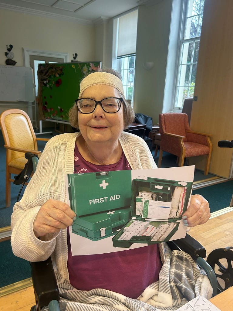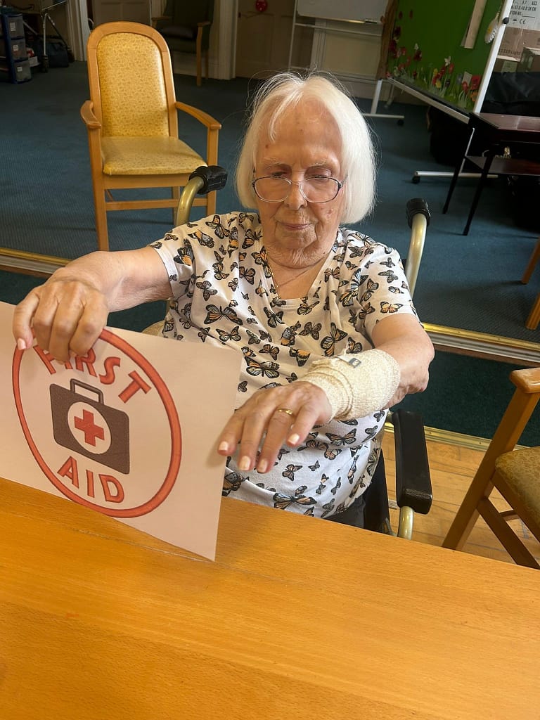 First Aid Face off…..residents enjoyed a friendly competition and got wrapping. This helped with hand and eye co- ordination whilst also having some fun.